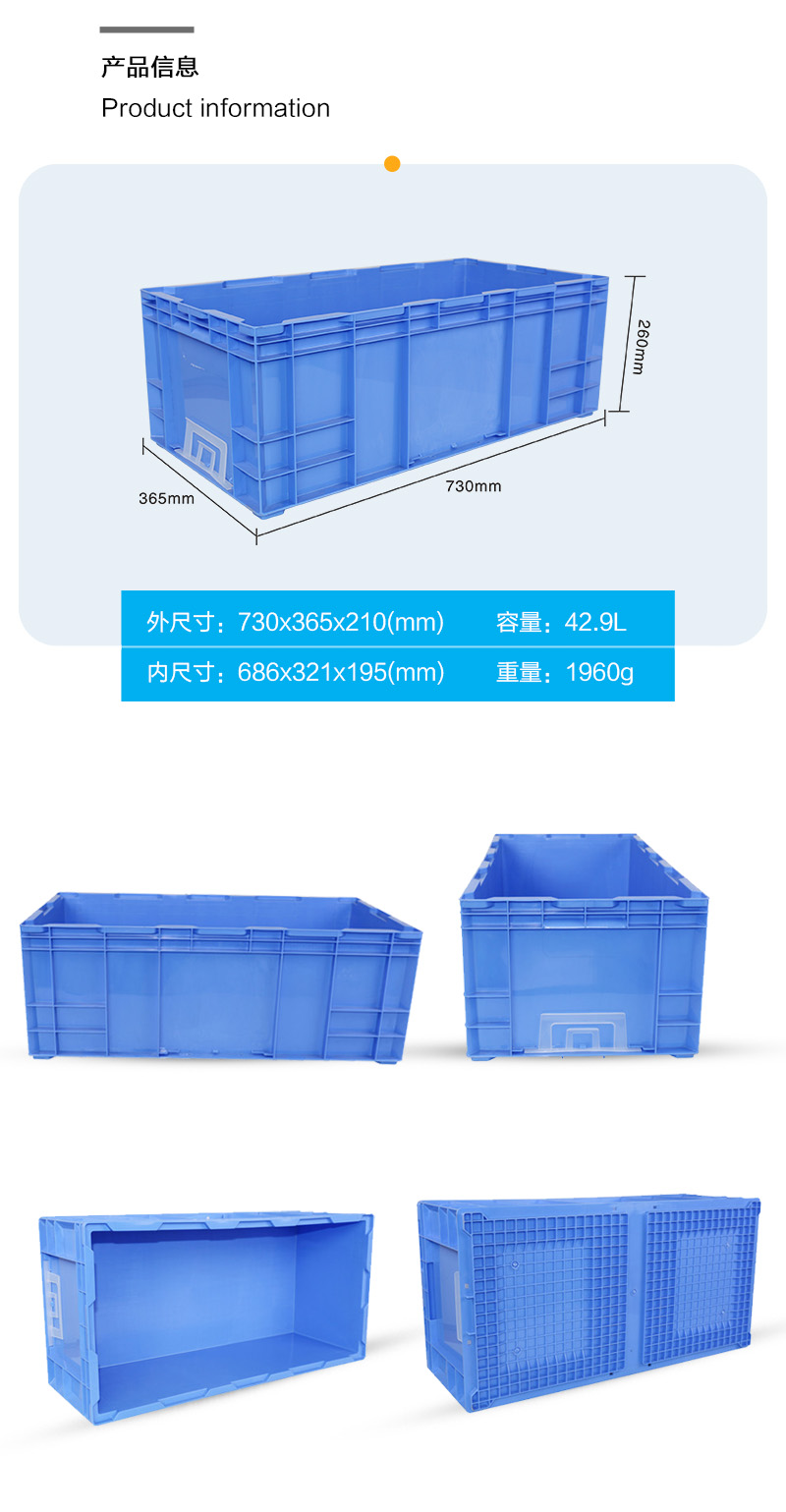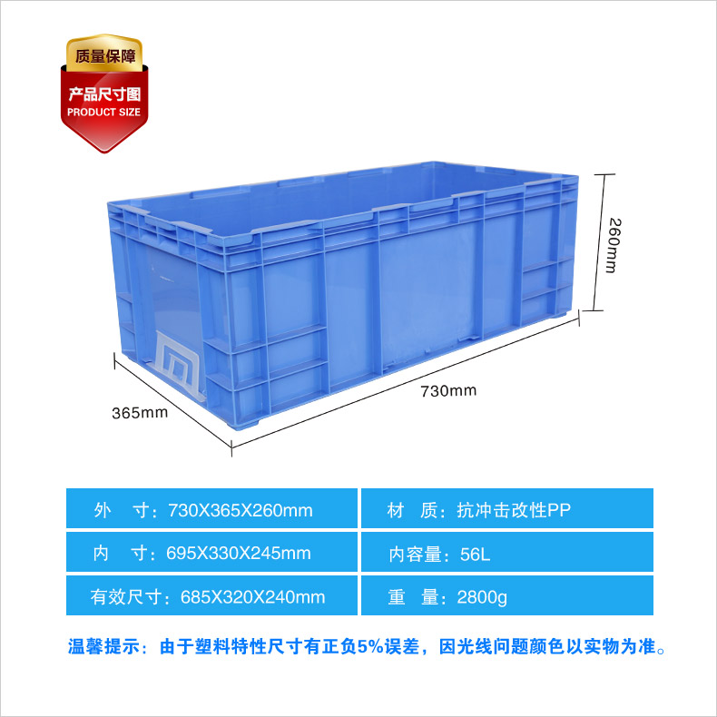 外尺寸:730*365*260mm 內(nèi)尺寸:649*321*245mm 材質(zhì):PP 重量:2800g